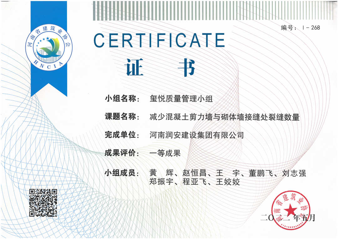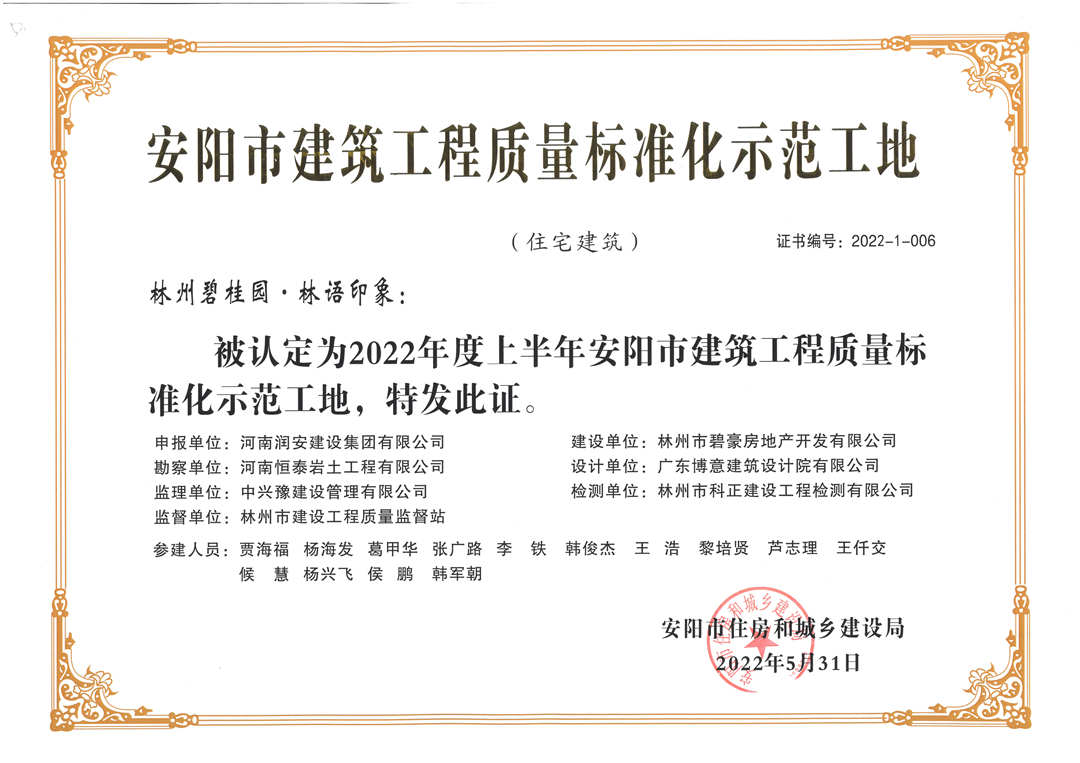 近期,集團公司承建的多個項目捷報頻傳,先后有“林州碧桂園?林語印象項目”,被評為2022年上半年安陽市建筑工程質量標準化示范工地;潤安楓林臺1-3、5-9號樓、林州碧桂園?天璽7號樓榮獲2022年度安陽市殷都杯工程獎。同時,吾悅鴻城質量管理小組、云頂質量管理小組、璽悅質量管理小組申報的三項課題均被河南省建筑業(yè)協(xié)會評為一等成果。